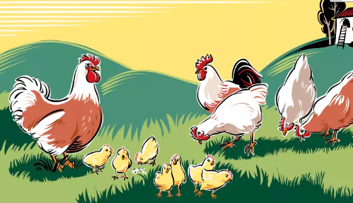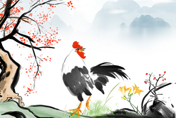 一群雞中最引人注目的當屬那只有著美麗花衣、趾高氣昂的大公雞了。威風凜凜的大公雞,粗糙堅硬如鷹鉤一樣的腳爪,肥碩艷紅的雞冠厚重,在頭頂上歪來倒去、顫搖不定,黝黑锃亮的